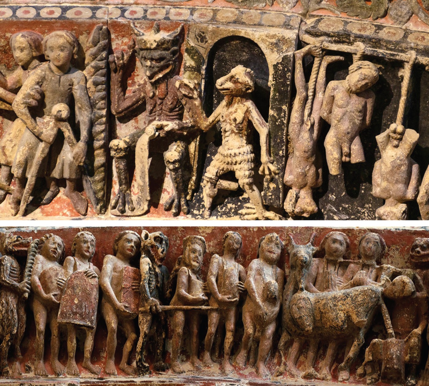 - Figuras humanas asociadas con los pecados capitales ingresando al Infierno en la arquivolta exterior del pórtico de la Majestad de la colegiata de Santa María la Mayor en la ciudad de Toro (Zaragoza, España).